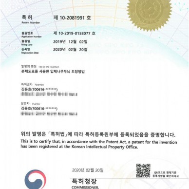 [특허증] 10-2081991 / 분체도료를 사용한 입체나무무늬 도장방법